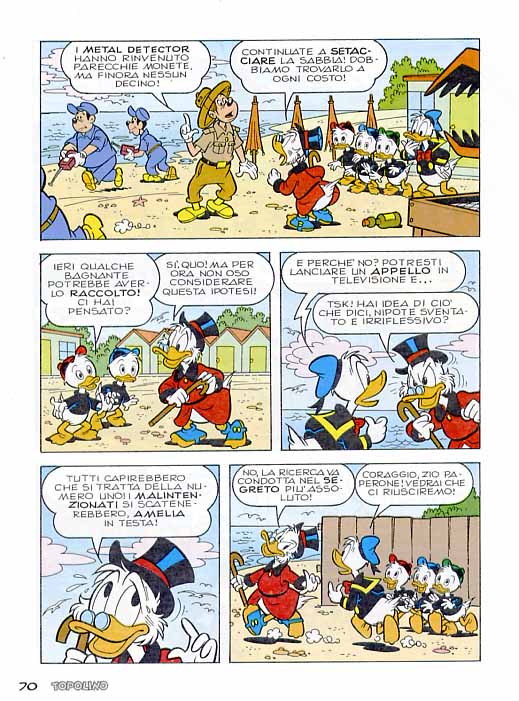 Complessiva. In preferenziale a sinistra, Direttore serio, Paperone teso-preoccupato, Paperino e i tre nipotini seri-attenti osservano la spiaggia davanti a loro, con fila di ombrelloni chiusi. Sulla spiaggia, un gruppo di uomini muniti di metal-detector portatili ispeziona la sabbia in lungo e in largo.